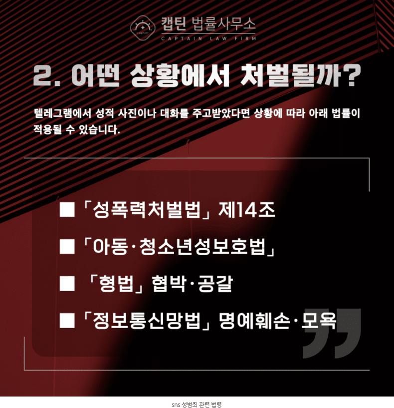 텔레그램에서 성적 사진이나 대화를 주고받았다면 상황에 따라 아래 법률이 적용될 수 있습니다.