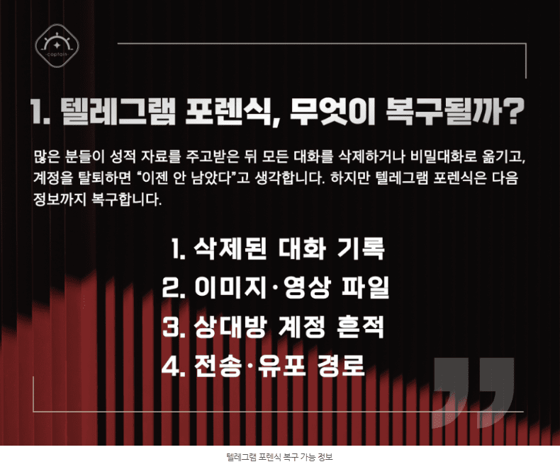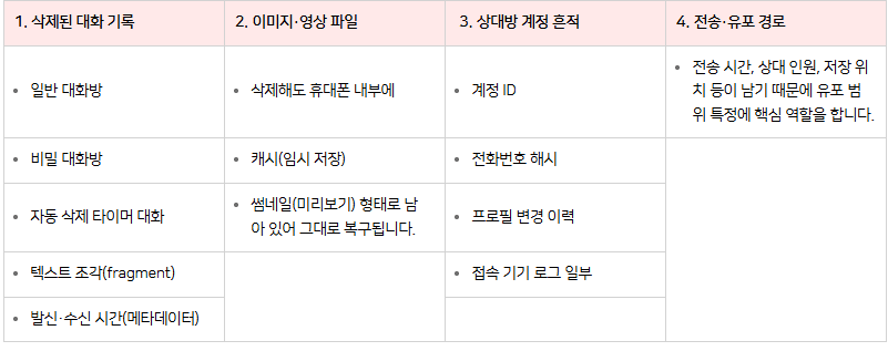 많은 분들이 성적 자료를 주고받은 뒤 모든 대화를 삭제하거나 비밀대화로 옮기고, 계정을 탈퇴하면 “이젠 안 남았다”고 생각합니다.