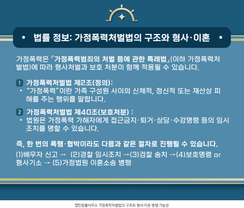 1. 법률 정보: 가정폭력처벌법의 구조와 형사·이혼 병행 가능성