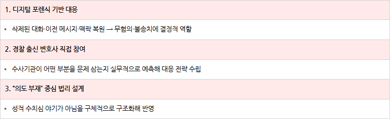 고소인은 불리한 부분만 제출하는 경우가 많습니다. 전체 대화를 복구해 상대가 먼저 농담을 했는지, 거절 표현 없이 대화를 이어갔는지 등을 구조화합니다. 이 과정에서 포렌식이 큰 역할을 합니다.