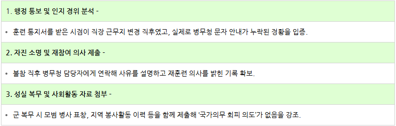 3. 캡틴법률사무소 예비군 불참 대응 전략: ‘고의성 부재’와 ‘즉각 대응’이 핵심입니다.
