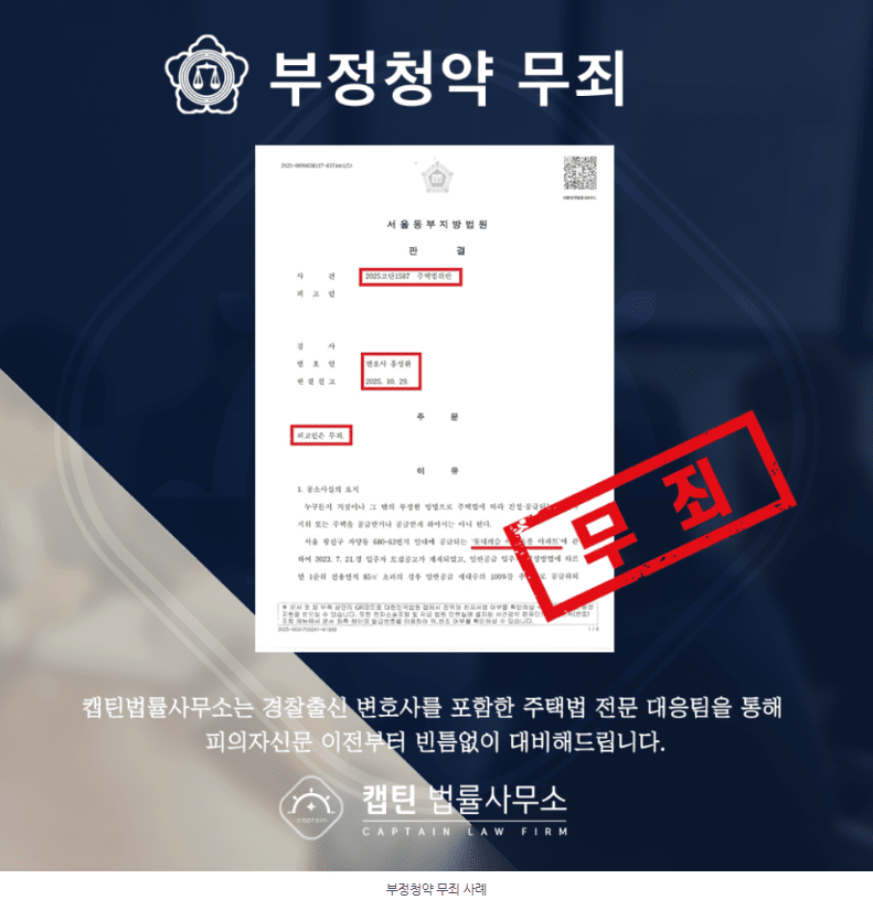 그 결과, 의뢰인은 ‘무죄’ 판결을 받았고 청약 당첨도 유지할 수 있었습니다.