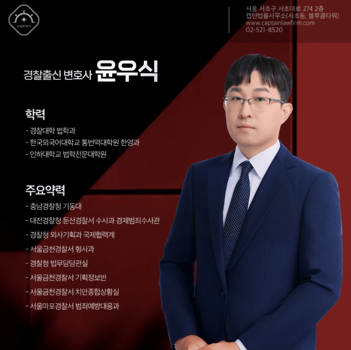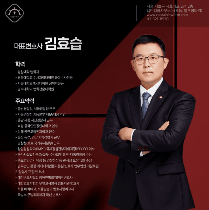 안녕하세요. 서초동 경찰 출신 형사전문변호사 캡틴법률사무소 김효습입니다.