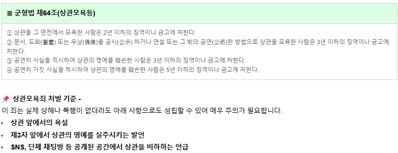 격앙된 발언이나 모욕적인 언사, 혹은 상관의 체면을 손상시키는 표현은 형법상 모욕죄를 넘어, 군형법 제64조 ‘상관모욕죄’로 처벌받을 수 있습니다.
