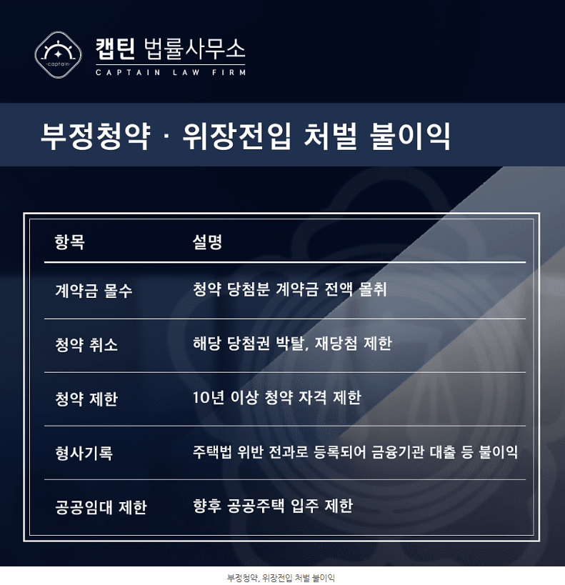 초기에 대응을 잘못하면 계약금 몰취–당첨 취소–10년 이상 청약 제한–주택법 위반 전과 기록까지 남을 수 있어 매우 위험합니다.