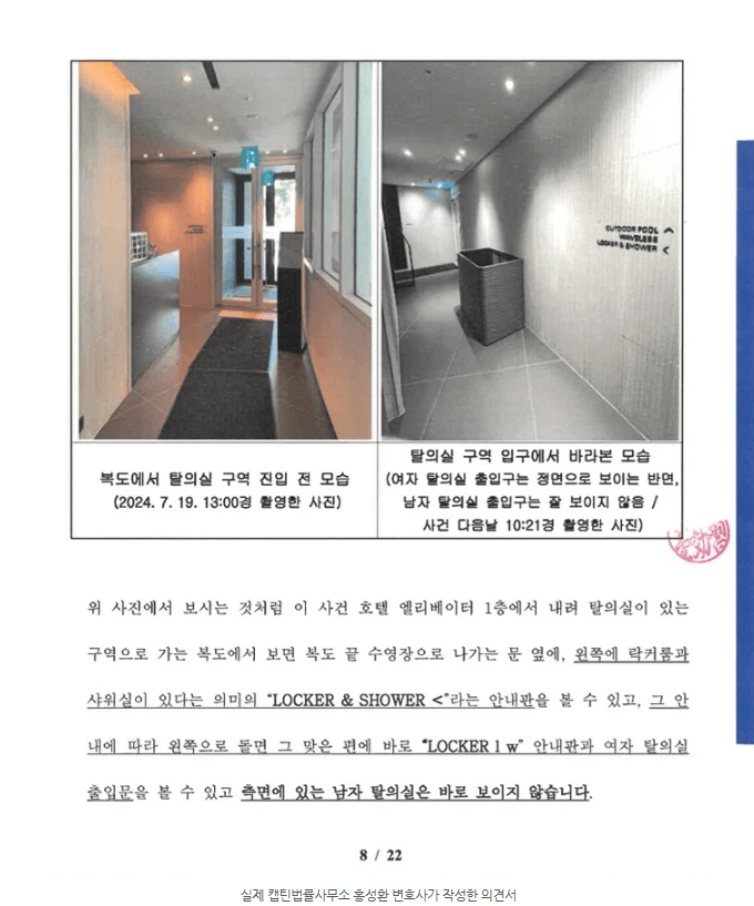 사건 발생 직후 변호사가 직접 제주도로 내려가 워터파크 구조, 탈의실 동선, 표지판 위치를 확인했습니다.