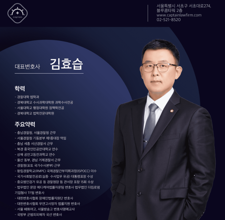 안녕하세요. 서초동 경찰출신 형사전문변호사 캡틴법률사무소 김효습입니다.