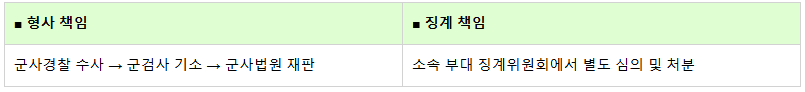 군인은 군형법과 군 인사법체계 안에 있는 신분이기 때문에, 하나의 행위로 두 개의 책임을 지게 됩니다.