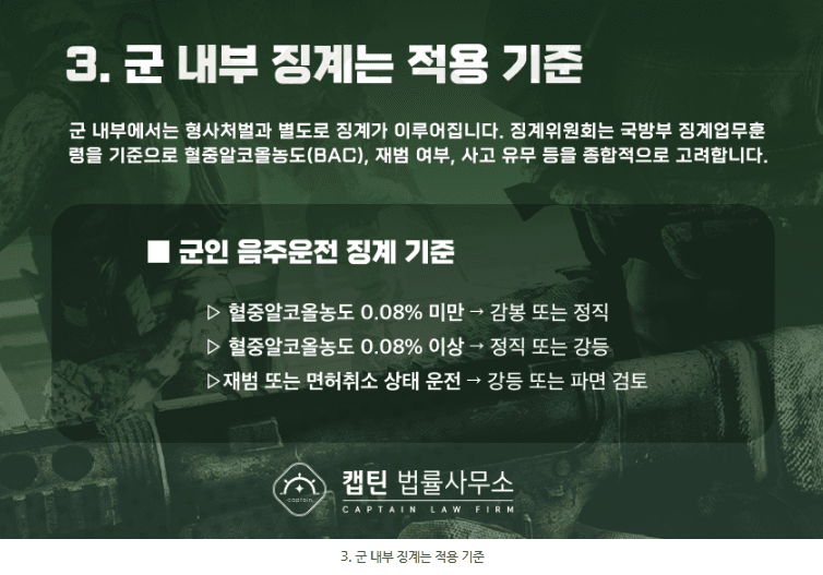 이 때문에 군인 음주운전 사건에서는 형사처벌보다 징계가 더 치명적인 결과가 되기도 합니다.