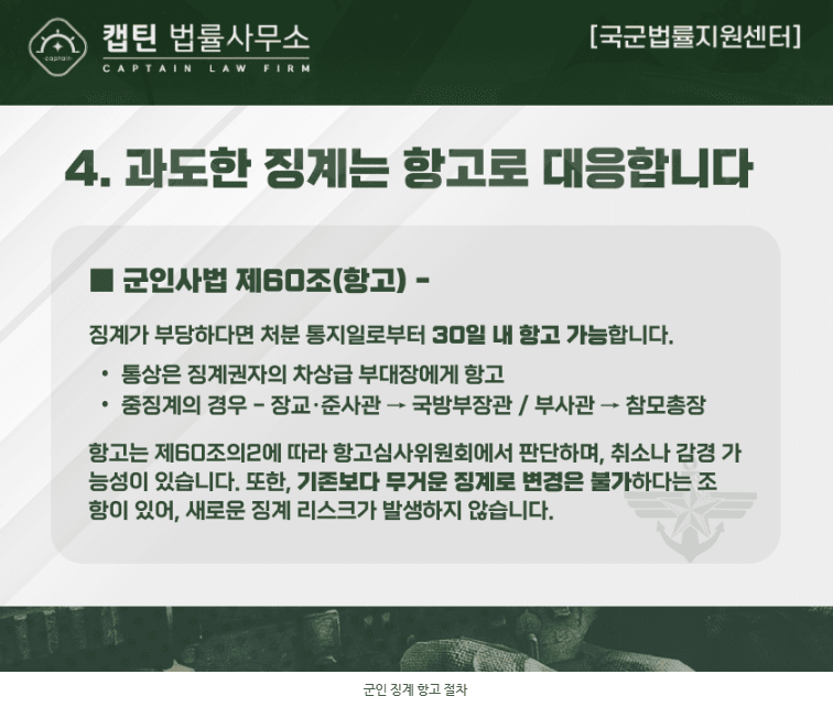 「군인사법」 제60조에 따라 처분 통지를 받은 날로부터 30일 이내에 항고가 가능하며, 이 과정에서 징계 수위를 다시 판단 받게 됩니다.
