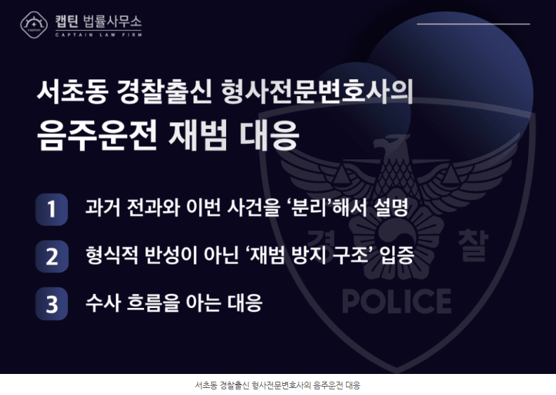 서초 음주운전 변호사로서 수많은 재범 사건을 다뤄본 경험상, 재범 사건은 초기에 방향을 잘못 잡으면 이후에 만회가 거의 불가능합니다.