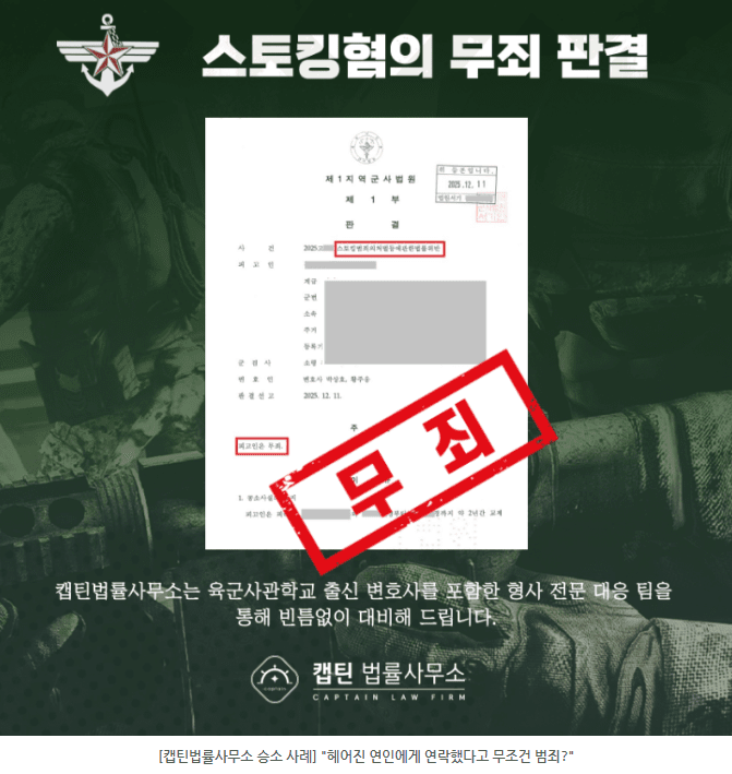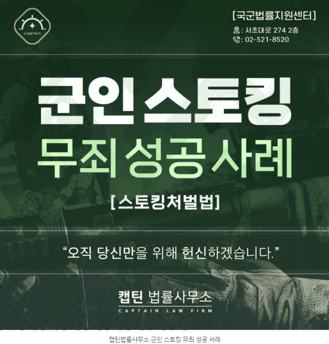 [법인소식] 군인 스토킹처벌법, 캡틴법률사무소 군인 스토킹 범죄 무죄 판결 성공 사례