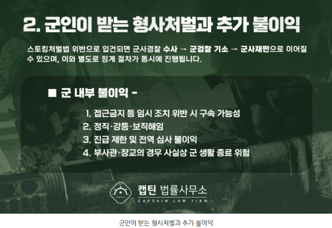 특히 군인에게 스토킹처벌법 위반 혐의는 형사처벌과 징계가 동시에 작동하는 이중 부담을 의미합니다.