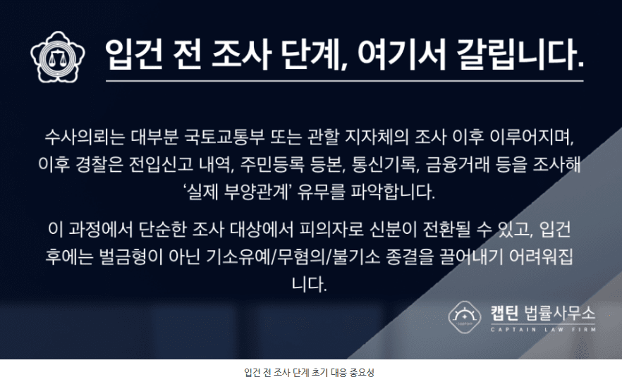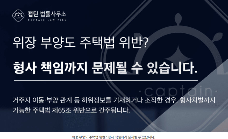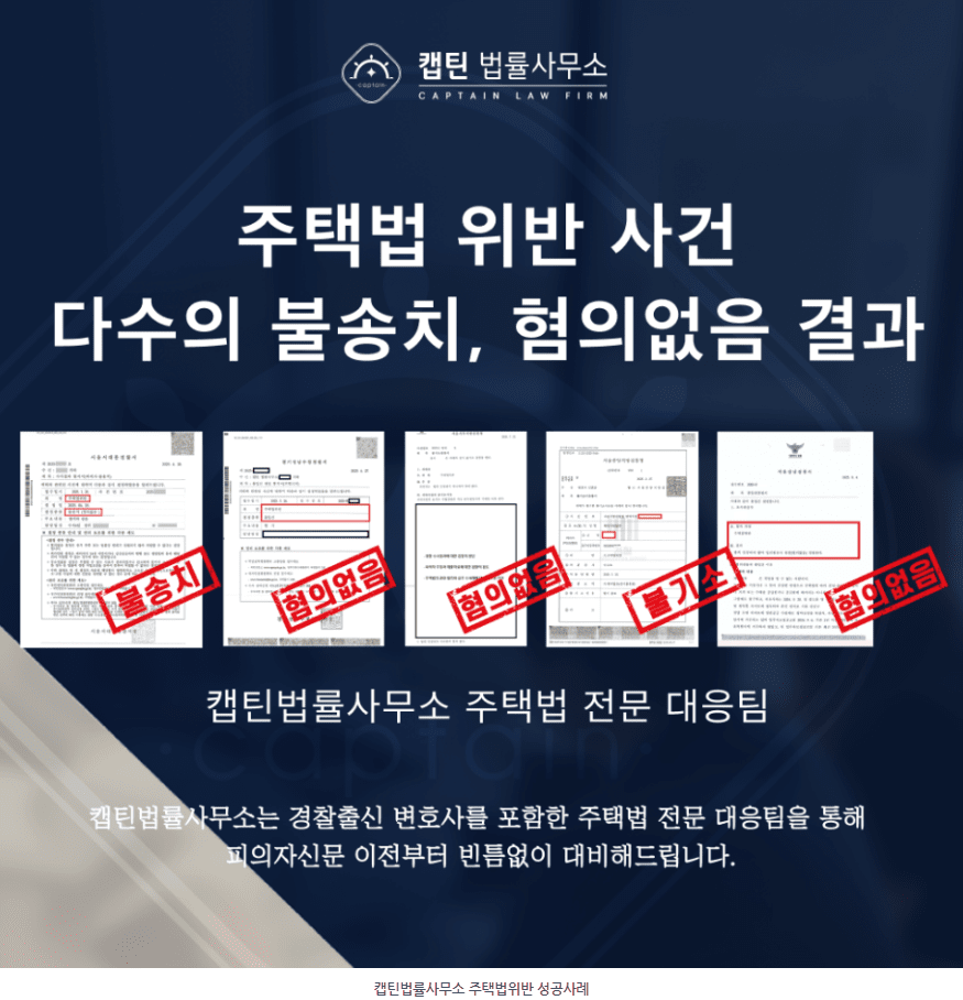 캡틴법률사무소 주택법위반대응팀는 일반 형사사건뿐만 아니라 청약 부정·위장전입·주택법 위반 등 부동산 관련 형사사건에 특화된 팀을 운영하고 있습니다.