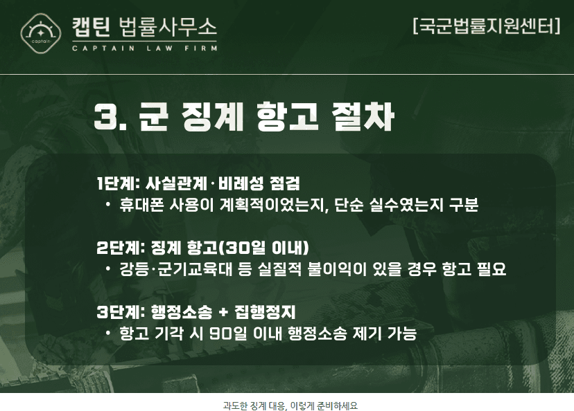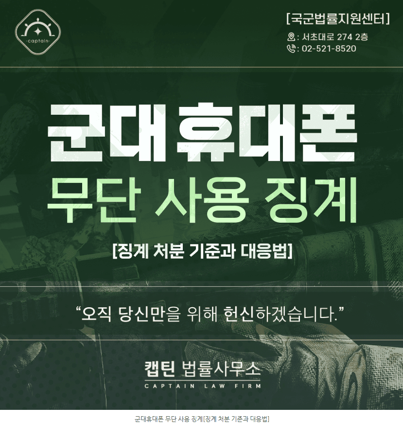 이상으로 군 복무 중 투폰 사용 관련 징계와 대응 전략을 정리해 드렸습니다. 캡틴법률사무소는 군 복무와 법 절차를 동시에 이해하는 전문가 팀으로서, 여러분의 경력과 전역 이후 미래를 지키기 위해 함께하겠습니다.
