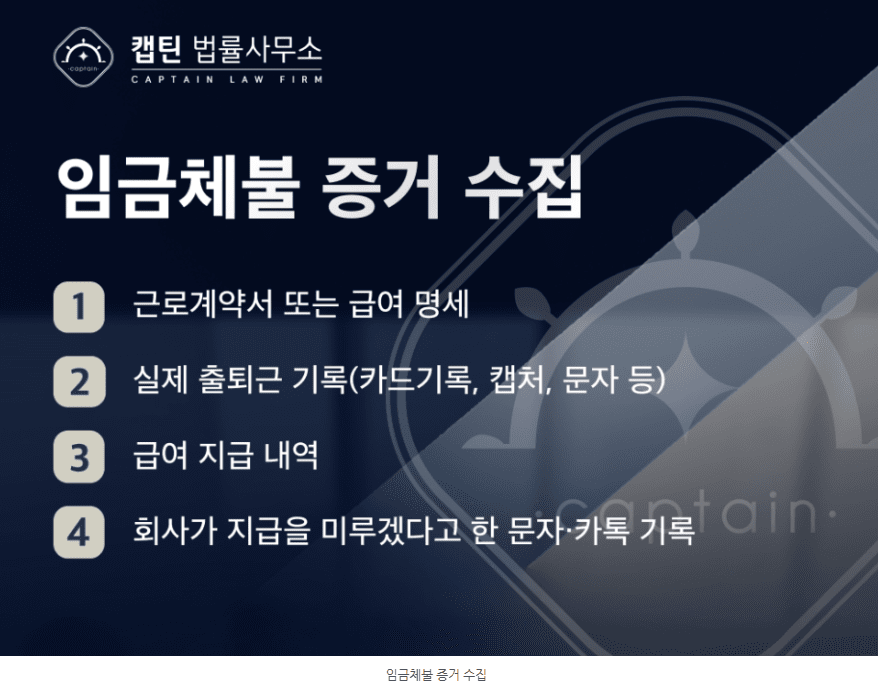 임금체불 조력 과정에서 가장 중요한 것은 “입증자료”입니다. 다음 4가지만 확보하면 사건은 빠르게 해결됩니다.