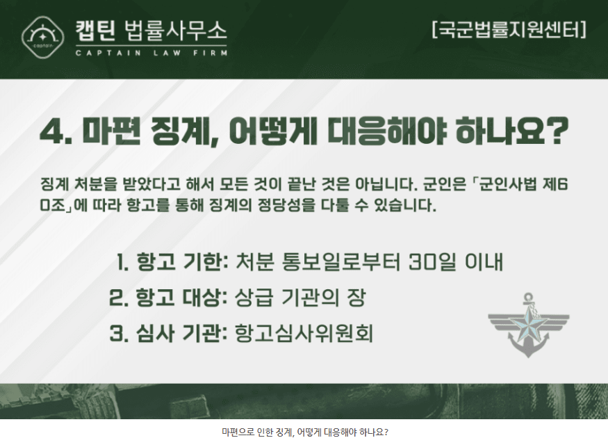 징계 처분을 받았다고 해서 모든 것이 끝난 것은 아닙니다. 군인은 「군인사법 제60조」에 따라 항고를 통해 징계의 정당성을 다툴 수 있습니다.