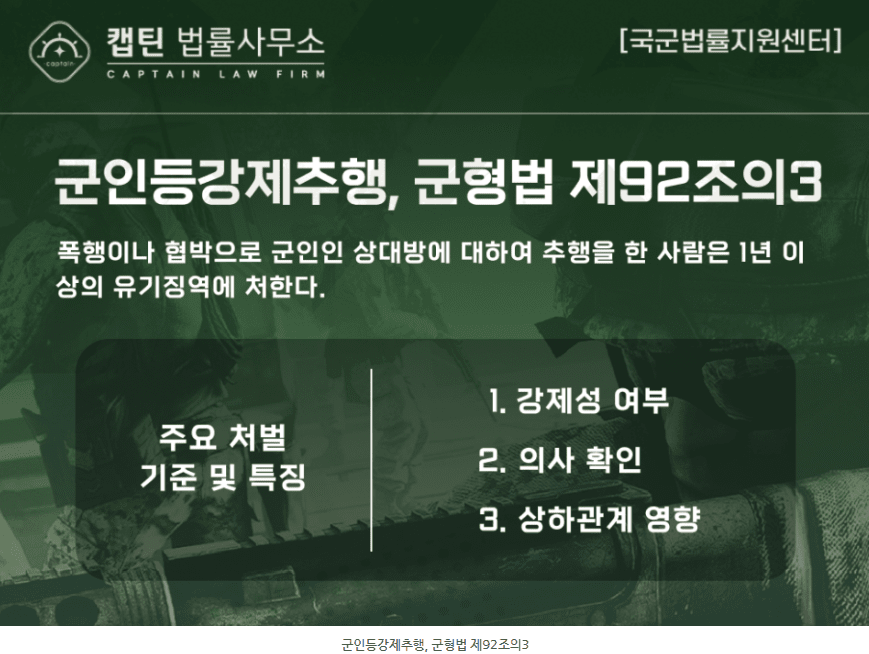 군인의 성범죄는 일반 형법이 아닌 「군형법」에 의해 별도로 엄격히 규율됩니다. 그중에서도 군형법 제92조의3(강제추행)은 군 복무 중 발생한 추행 행위를 매우 무겁게 처벌하는 조항입니다.