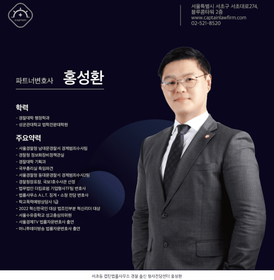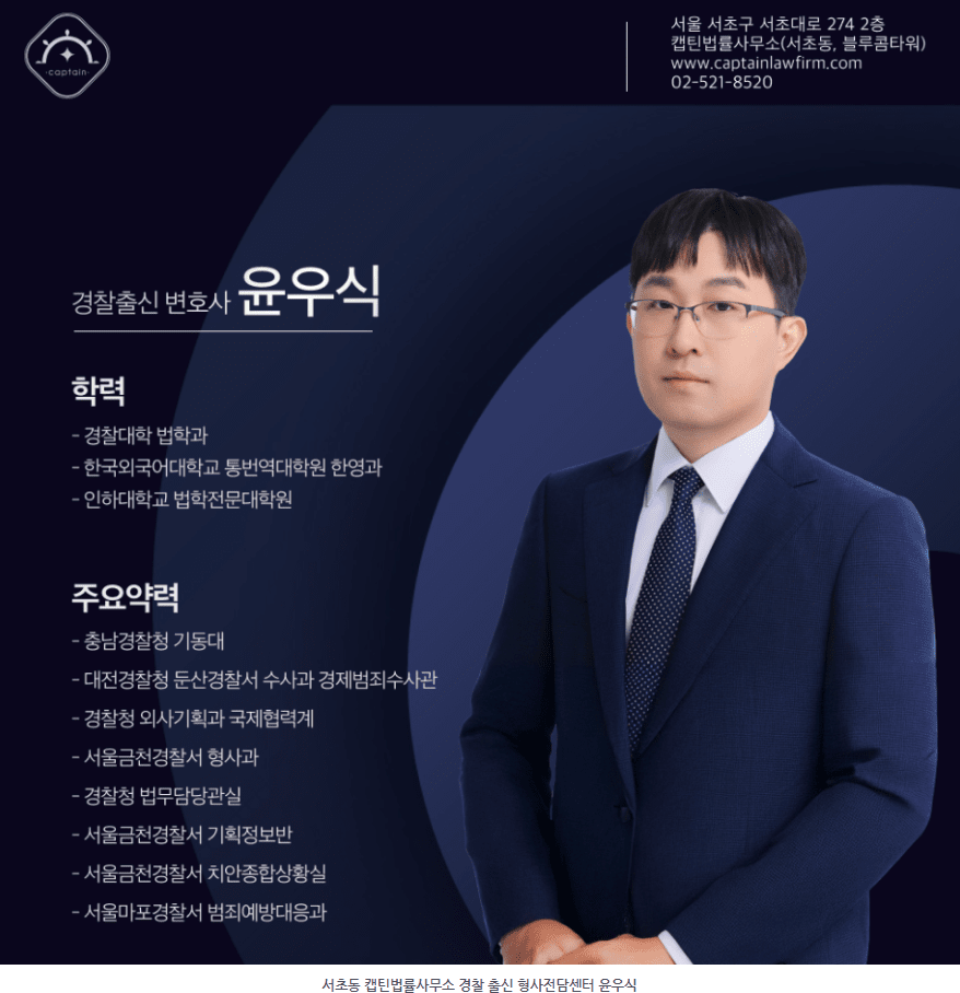 안녕하세요. 경찰 출신 형사전문변호사 캡틴법률사무소 김효습입니다.