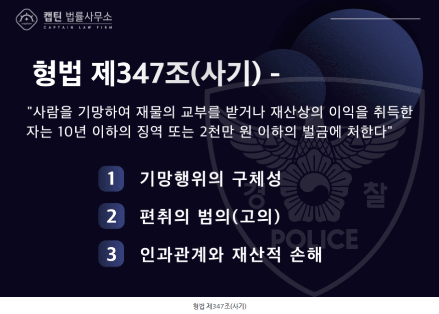 캡틴법률사무소 형사전담센터는 수사 현장에서의 풍부한 실무 경험을 바탕으로, 이 사건을 관통하는 사기죄의 성립 요건과 법률적 쟁점을 심층 분석해 드립니다.