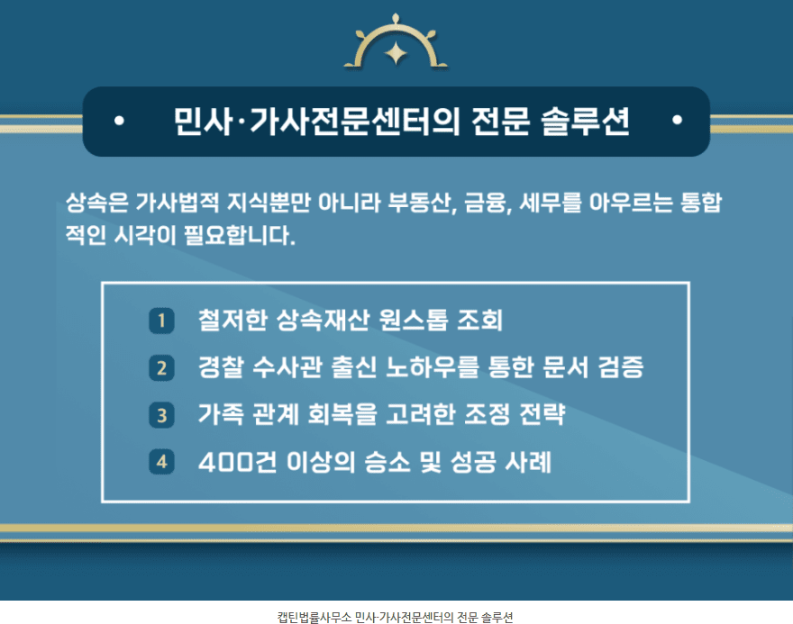 가족 간의 대화가 막막하거나, 이미 누군가의 독단적인 행동으로 재산권이 침해되었다면 주저하지 마십시오. 캡틴법률사무소 민사·가사전문센터풍부한 실무 경험과 단호한 법리 대응으로 당신의 정당한 몫을 되찾아 드리겠습니다.