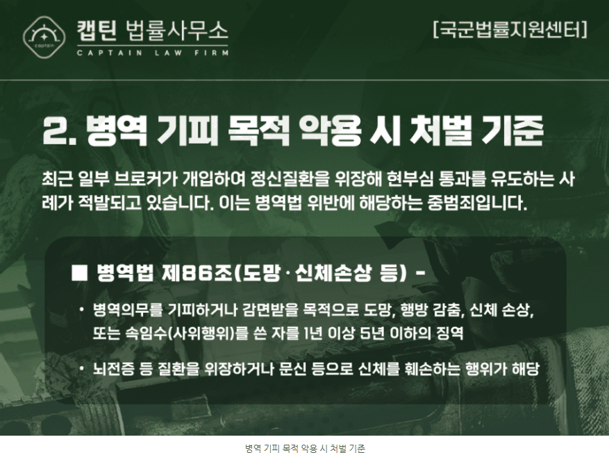 최근 일부 브로커가 개입하여 정신질환을 위장하거나 부상을 부풀려 현부심 통과를 유도하는 사례가 적발되고 있습니다. 이는 단순한 도덕적 비난을 넘어 형법 및 병역법 위반에 해당하는 중범죄입니다.