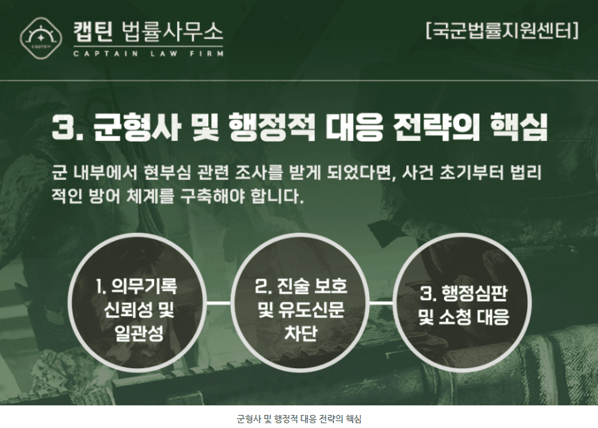 군 내부에서 현부심 관련 조사를 받게 되었다면, 사건 초기부터 법리적인 방어 체계를 구축해야 합니다.